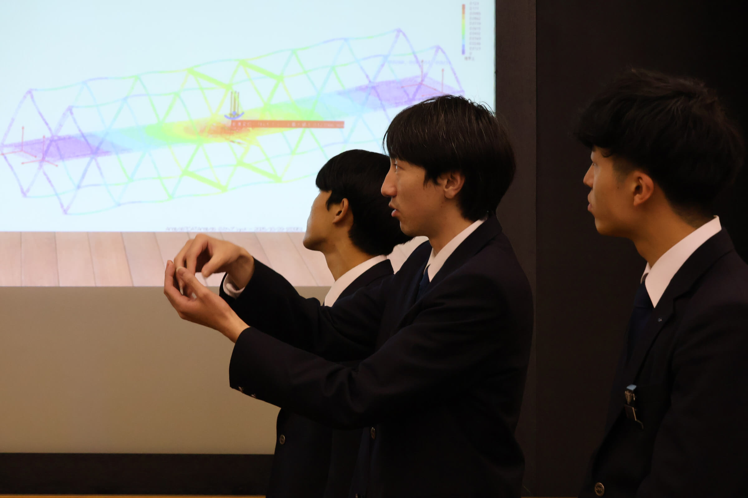 同社の現役エンジニアを講師として迎え、まず1日目にはCAD演習、CAM演習、2日目には強度解析、振動解析のCAEシミュレーションを学びました。3日目にはグループに分かれて、橋梁の設計を課題として与えられました。要件は橋床の「たわみを最小にする」という最適設計行うというものであり、学生は時間を忘れて取り組みました。