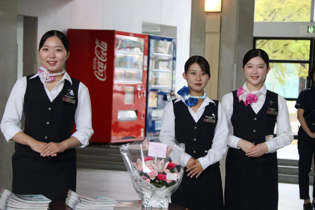 ・キャビンアテンダント・グランドスタッフ科の生徒がお客様を笑顔で出迎えている様子