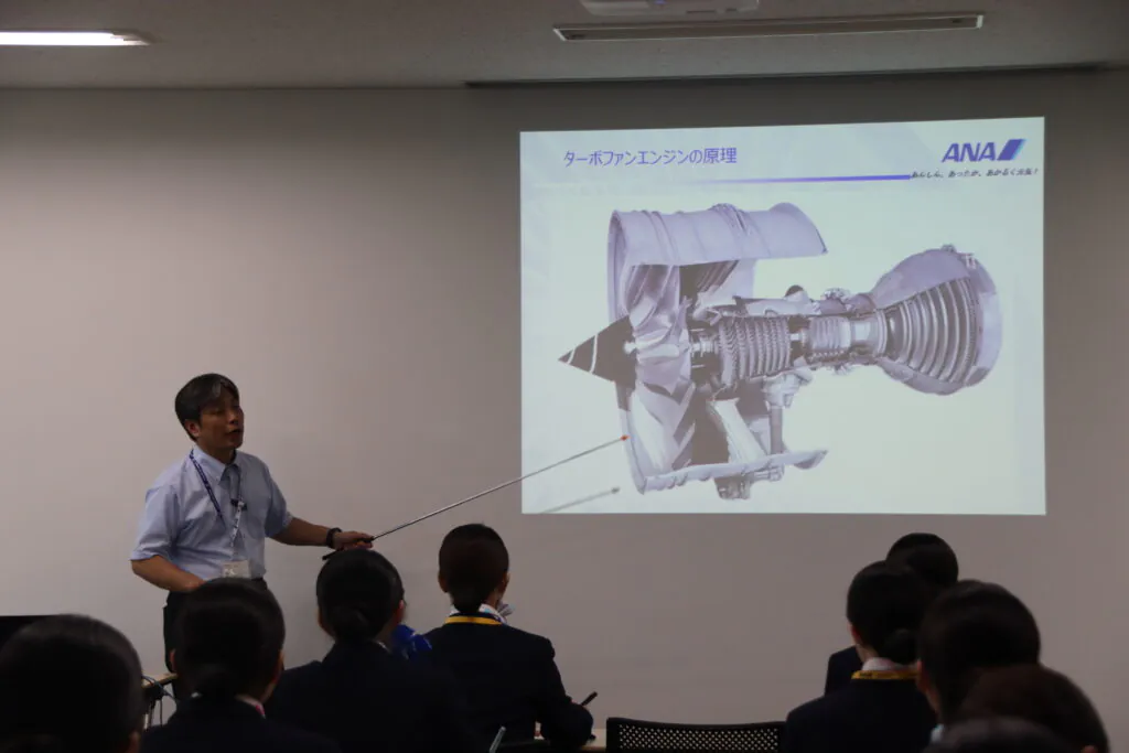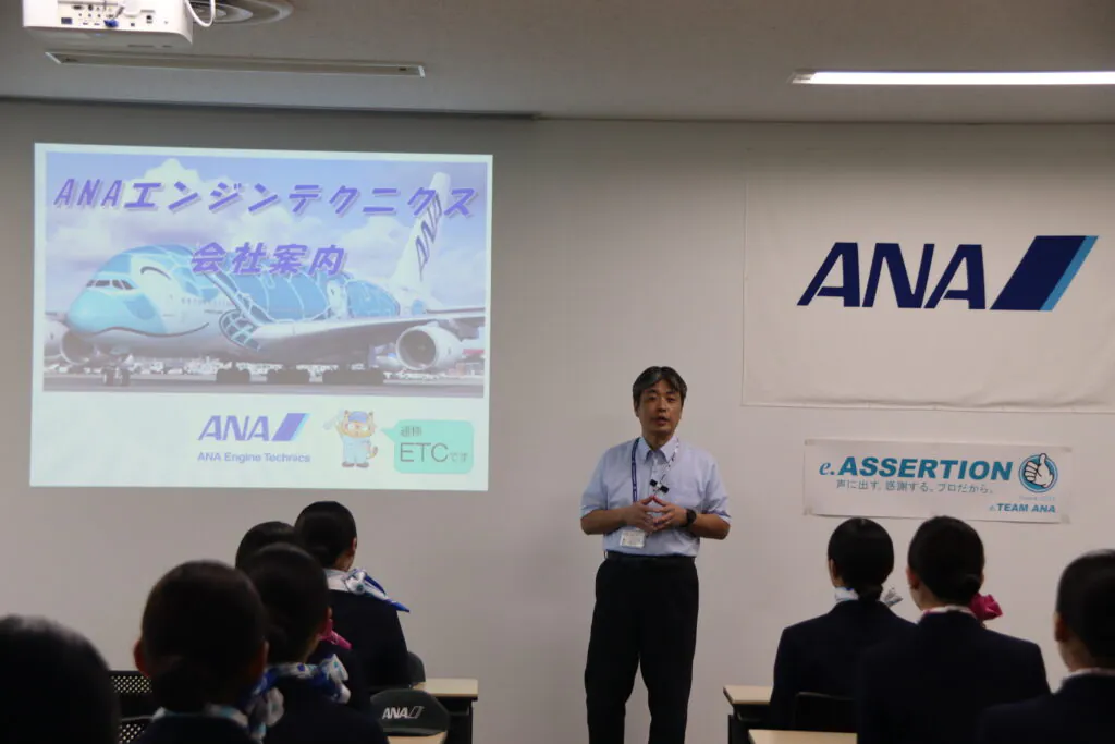 午後からは、ANAエンジンテクニックスの工場見学を行い、航空機エンジンの整備現場を間近で見学しました。専門的な解説を通じて、航空業界の技術力や安全管理の重要性を学ぶ貴重な時間となりました。