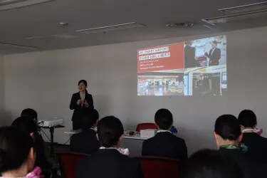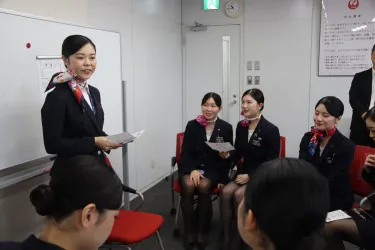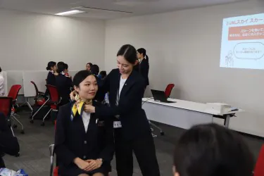 また企業説明会にて行って頂いた様に企業説明も行って頂きその中で、スカーフの巻き方や、アナウンスの体験を行わせていただき業務の一部を体験する機会を頂きました。