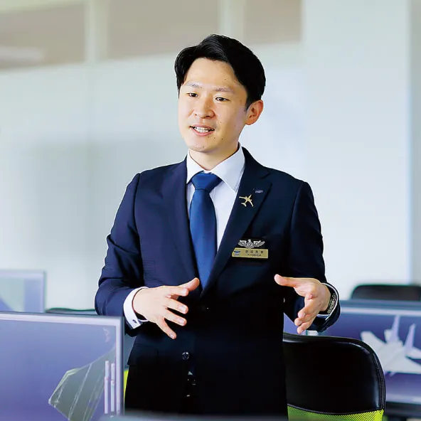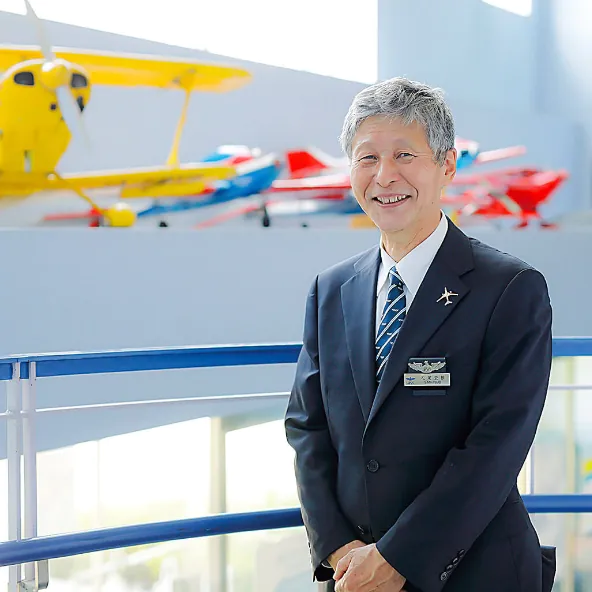 私は本校での教職を務めながらANAの機長としてボーイングやエアバスに乗務しています。パイロットとしての経歴は、自衛隊、航空機使用事業、エアラインなどさまざまです。総飛行時間は2万時間を超えました。 私のような現役のエアラインパイロットやCAが直接指導することは、学生にとっては本校で学ぶ大きな魅力ではないかと思います。私の方から学生に個々に出向いて話しかけ、身近なアドバイザーとして頼ってもらえるような指導を心がけています。学生からの質問には、LINEグループを活用して常時対応しています。全体的な勉強環境としても、最先端の設備があり、その時々の自然や人とのつながりの中で最大のパフォーマンスを発揮する訓練を積めるので、パイロットを目指すのにこれ以上ない場所ではないかと感じます。 自分の目指す目標に向かって勉学に励む学生は、授業を受ける姿勢や態度に活気があり、疑問点があればいくらでも聞いてきます。ここでは毎日が自分を成長させてくれるフィールドです。本学で学ぶ「今」を大切に、その全てが将来につながってくることをイメージしながら、世界で活躍するパイロットとして羽ばたいて行ってください。夢の実現に向けて共に学ぶ仲間を待っています!